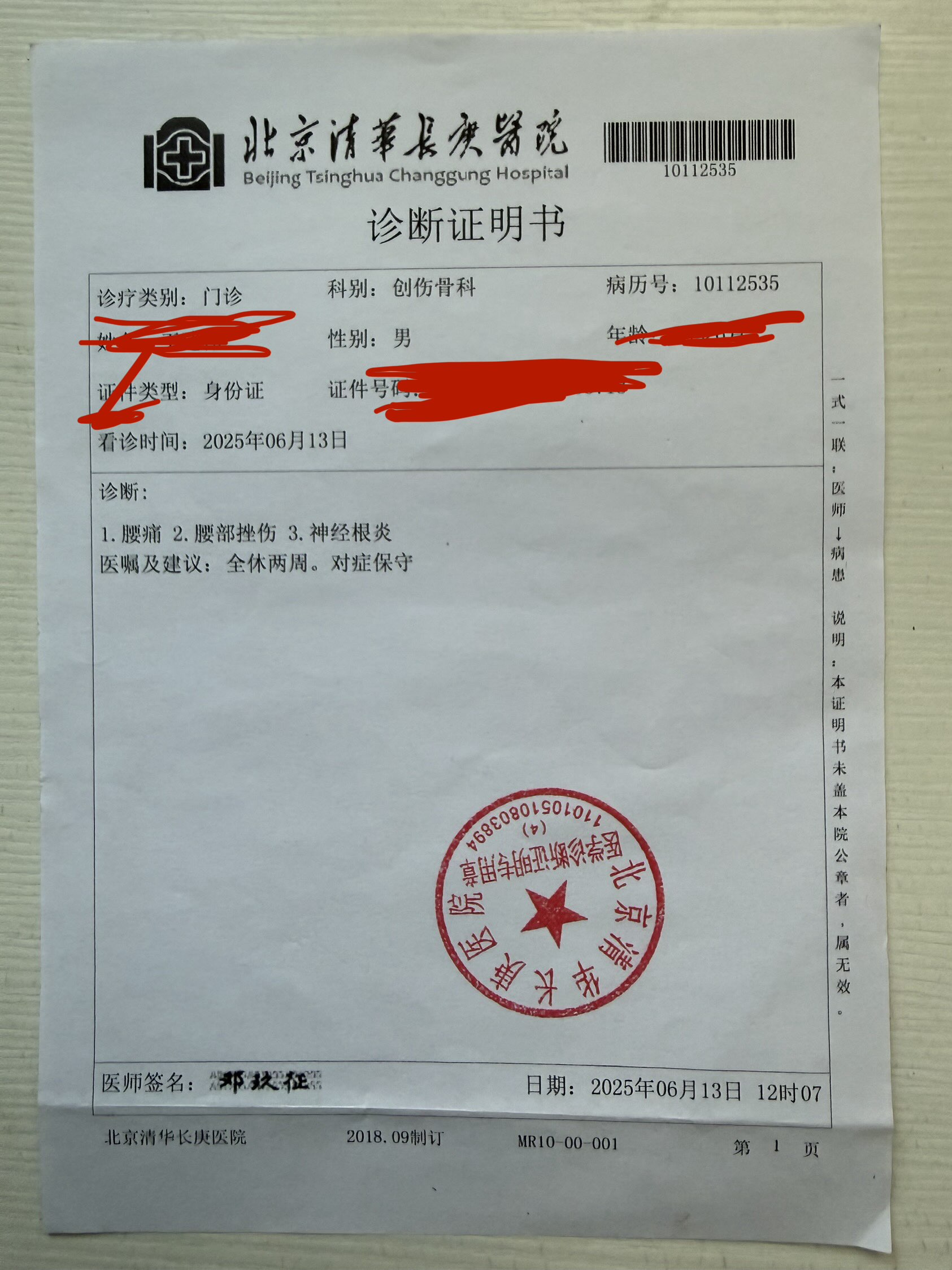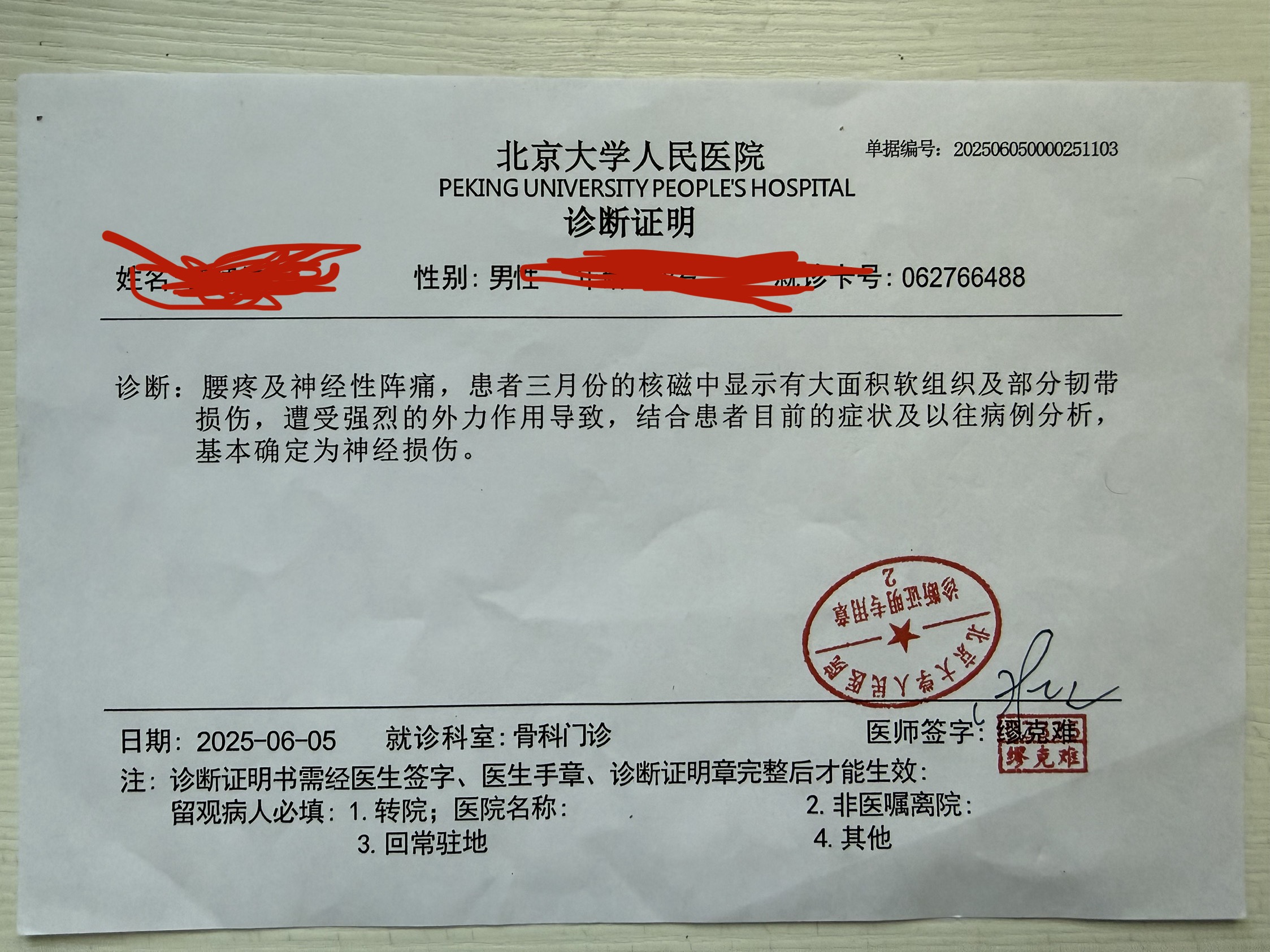 但在王先生看来,他认为,自己之所以受伤,是因为景区蹦极设备出现问题以及操作人员失误,下降速度过快,导致自己没有落到保护垫上。而数月后,他到北京大学人民医院检查时,医院诊断为腰疼及神经性阵痛,患者三月份的核磁中显示有大面积软组织及部分韧带损伤,遭受强烈的外力作用导致,结合患者目前的症状及以往病例分析,基本确定为神经损伤。