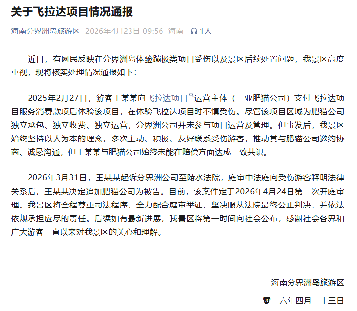 4月23日,海南分界洲岛旅游区对这起游客体验飞拉达项目受伤事件发布情况通报称,游客王某某在参与该景区内飞拉达项目时受伤,目前已就赔偿事宜起诉运营方及景区,案件定于4月24日第二次开庭审理。景区回应称,该项目区域为第三方公司独立承包和运营,双方在赔偿方面始终未能达成一致。